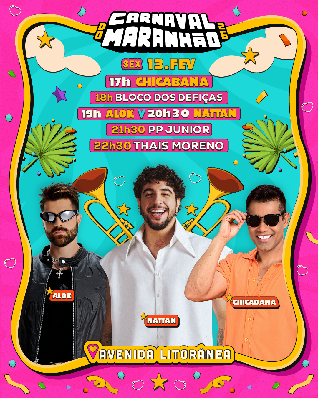 Grandes atrações nacionais e locais estarão na Avenida Litorânea de sexta-feira a terça-feira de Carnaval. Sexta-feira São Luís recebe Nattan, Alok, Chicabana