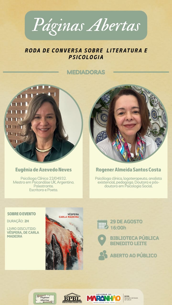 Realizado no Salão de Referência da Biblioteca, o debate contará com participação e mediação das renomadas psicólogas maranhenses: Eugênia de Azevedo Neves e Rogener Almeida Santos Costa, que trarão a leitura e os diferentes olharem sobre o livro “Véspera”, da escritora Carla Madeira.
