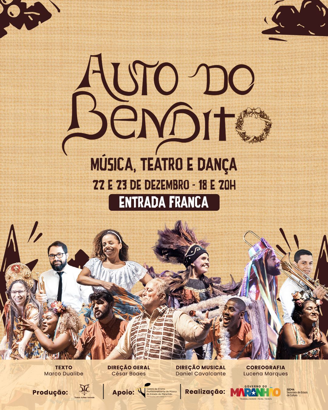 Nos dias 22 e 23 de dezembro, o espetáculo “O Auto do Bendito” retorna ao Teatro Arthur Azevedo com duas sessões diárias às 18h e 20h, trazendo uma narrativa natalina ambientada na Praia Grande e marcada pela força da cultura, da fé e da identidade maranhense.