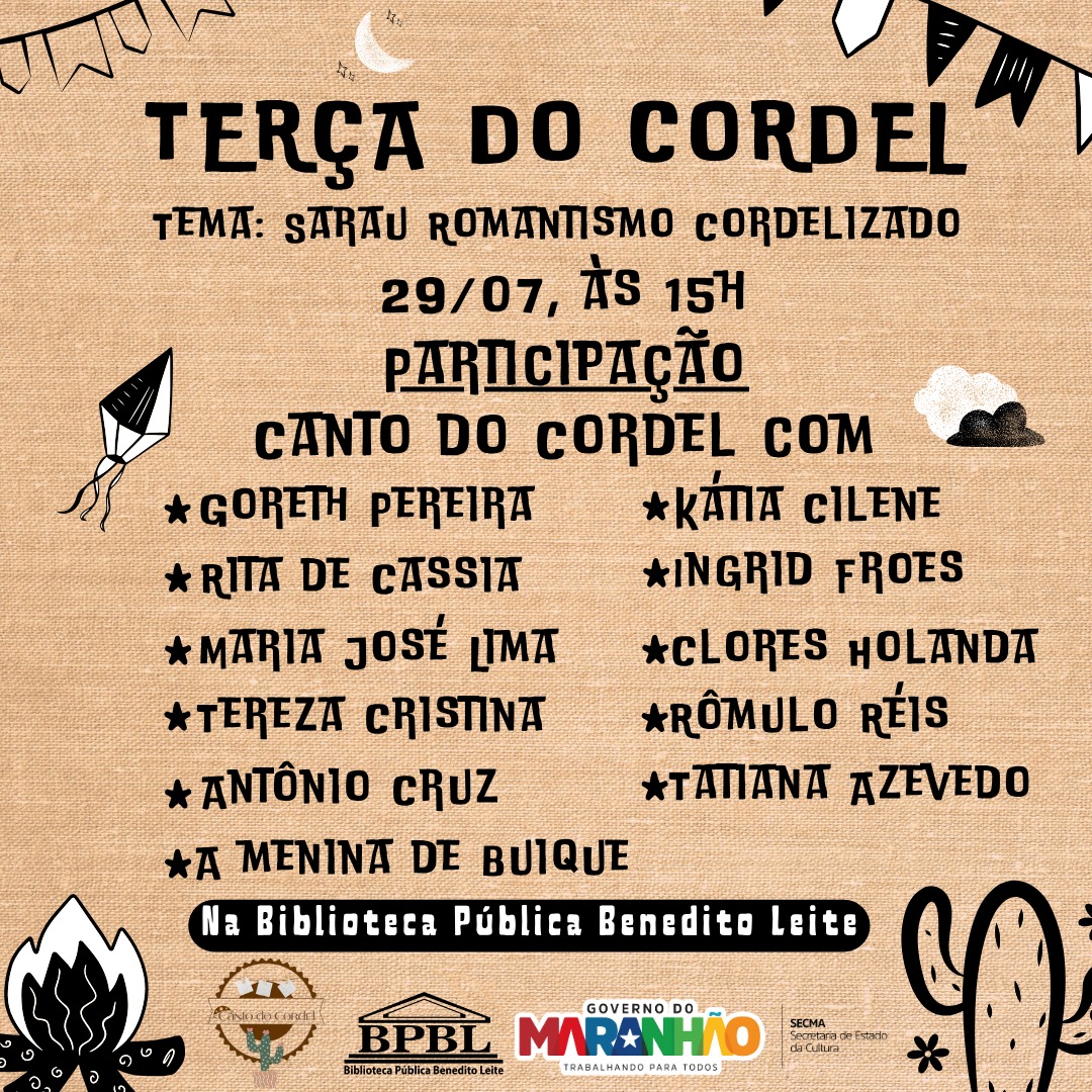 Nesta terça-feira (29/7), a Biblioteca Pública Benedito Leite (BPBL) realiza mais uma edição da “Terça do Cordel”, com início previsto para 15h. Neste mês, o evento conta com o Sarau Romantismo Cordelizado, com diversas músicas que marcaram época, além de textos do gênero literário.